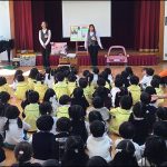 2月4日(火) 劇団バクの皆さんをお招きして,全園児で「ピノキオ」の人形劇を観劇しました。幕の後ろから大きな人形が登場すると歓声があがりました。ピノキオがクジラに飲み込まれるシーンに驚いた子供がいましたが,ジェペットおじいさんと一緒にクジラから脱出して助かると,ホッとした表情になっていました。劇が終わった後の「綱引き」で大盛り上がりし,ニコニコ笑顔でした。ひまわり組の子供たちも静かに人形劇を楽しみました。最後に,「ありがとうございました」の言葉をみんなでお伝えし,大きな人形とタッチをしてお別れをしました。