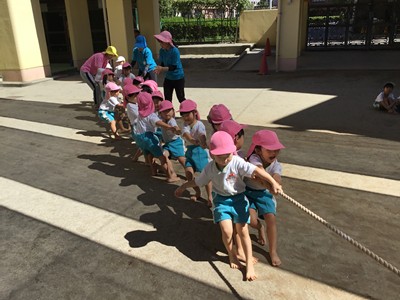 年少さんは、もも組VSばら組で勝負! ひまわり組さんも年少さんに半分ずつに分かれて一緒に参加して楽しみました。