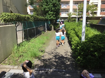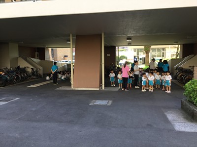 園庭に避難後、すぐに近くのサンハイツに垂直避難する訓練を行いました。