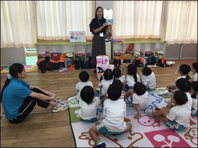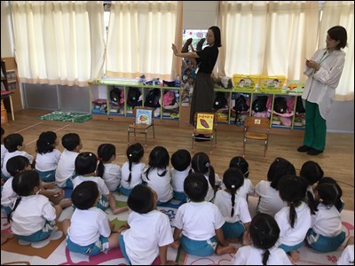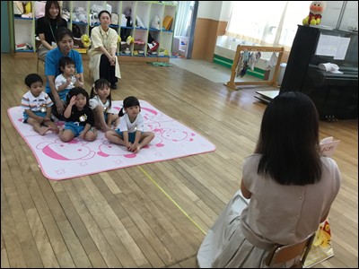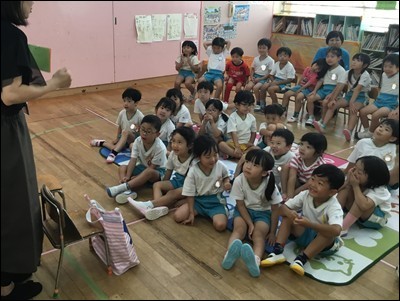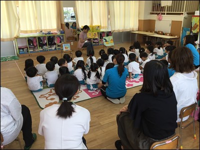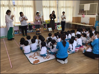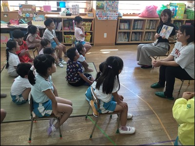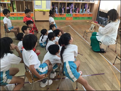 今回は、年少少さんには、「おにぎり」の読み聞かせ、大型絵本「どうぶついろいろかくれんぼ」、パペットを使っての「くまさんのおでかけ」、年少さんには、季節に応じた「さつまのおいも」の読み聞かせ、「くまさんのおでかけ」、手遊び「むしかご」、年長さんには、「かちかちやま」「おならうた」の読み聞かせなどを行ってくださいました。特に「おならうた」は大好評で、子供たちもニコニコ笑顔で聞き入っていました。