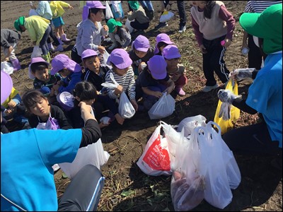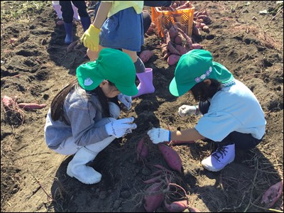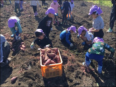 収穫したさつまいもは、給食で焼きいも、スイートポテト、大学いも、さつまいものみそ汁などのメニューとして、提供される予定です。子供たちは、とても楽しみにしています!