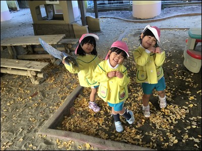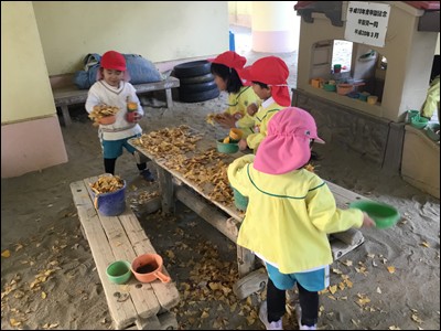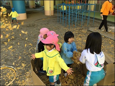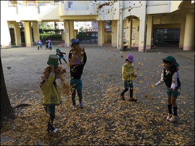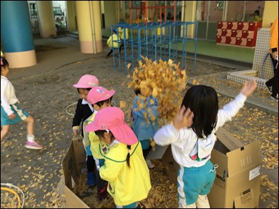 落ち葉を使って、ごっこ遊びを楽しんだり、上に投げて落ち葉シャワーを浴びたりと、それぞれが楽しい遊びに取り組みました。