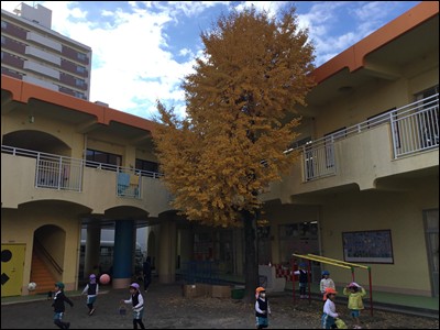 本園のシンボルツリーである園庭のいちょうの木の葉が黄色に色づき、落葉していました。