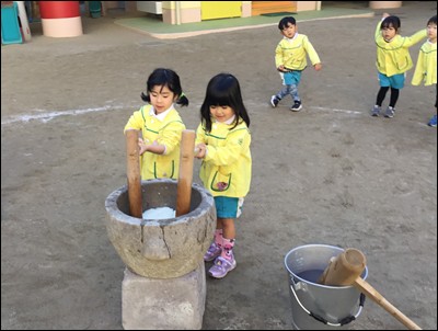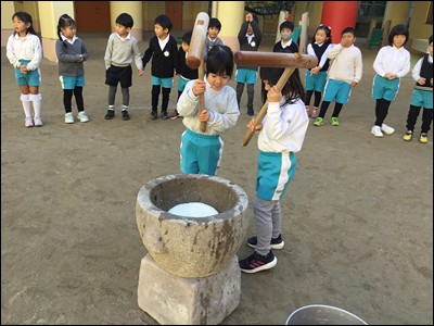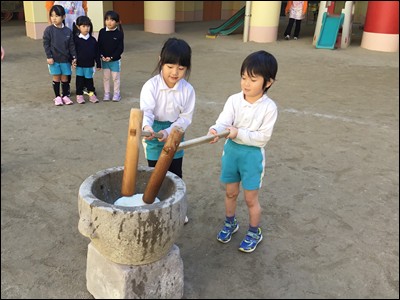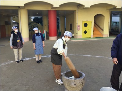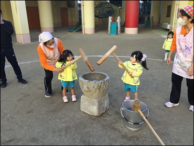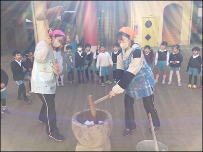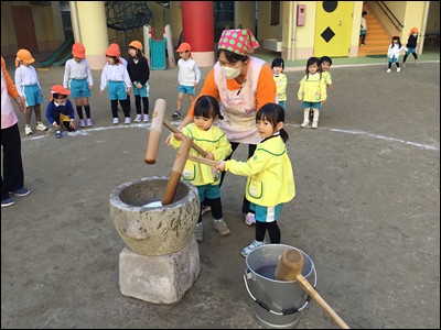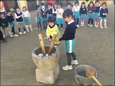 臼と杵を使い、「ぺったん、ぺったん」ともちつきをしました。