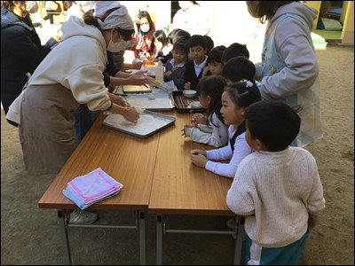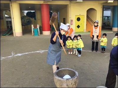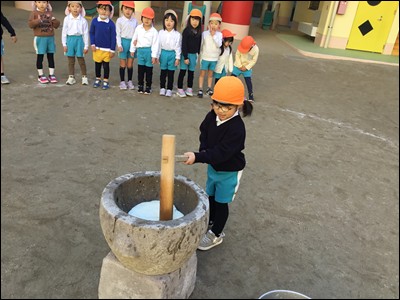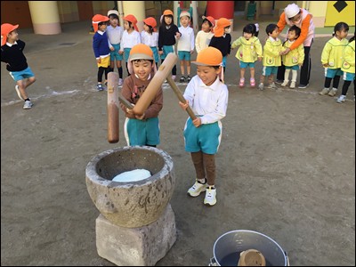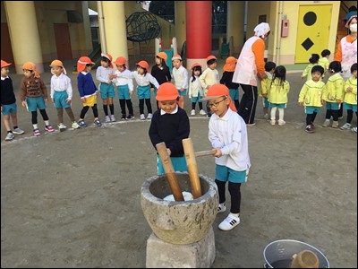 ひまわり組さんからはじめ、全園児が交代でもちつき!