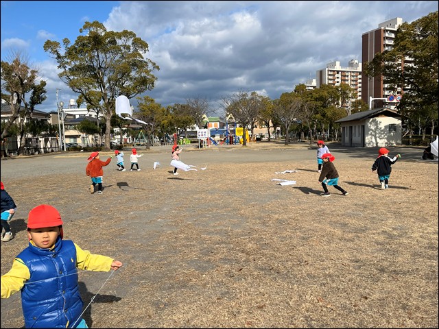 年少さんのもも組・ばら組の子供たちが、近くの本町公園に出かけ、凧あげにチャレンジ!