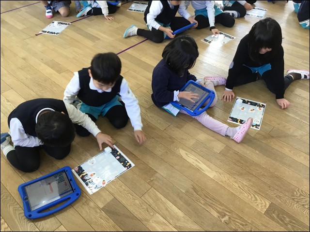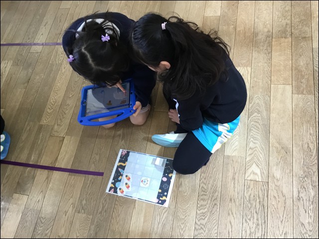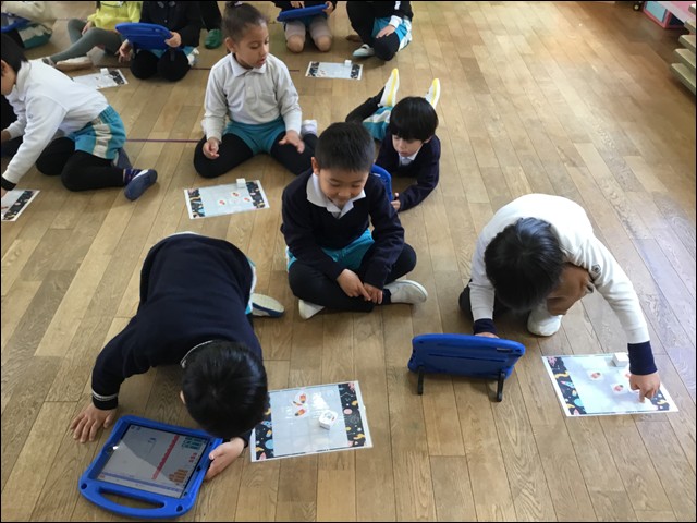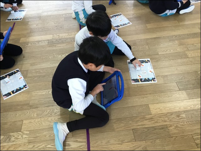 子供たちが自分でプログラムを考え、その指令通りにボックスが動くか、子供たちはお友達と考えを出し合いながら協力して取り組みました。