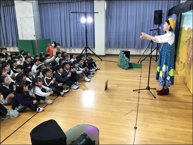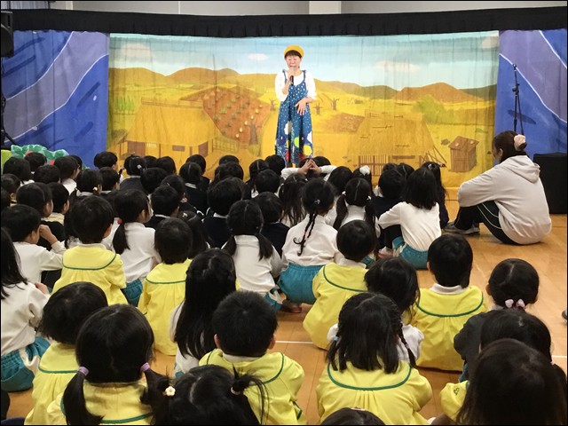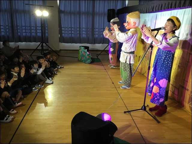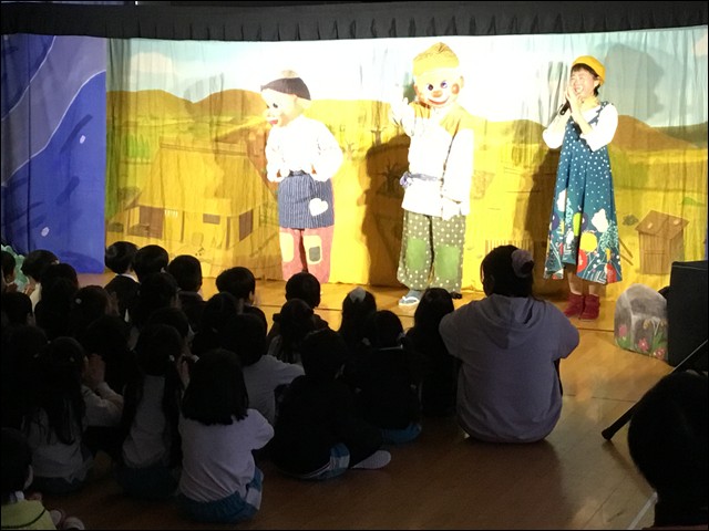 「花咲かじいさん」のおなじみのお話に楽しい歌と踊りを交える劇に、子供たちは真剣に見入っていました。