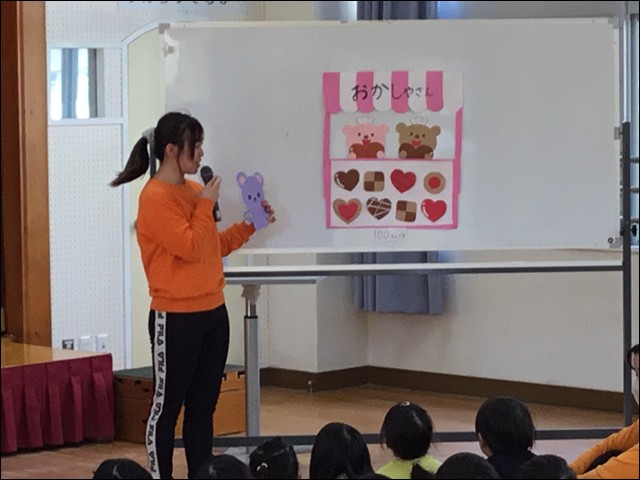 ハートの形などのクッキーやチョコレートが並んだお菓子屋さんに、オレンジ・ピンク・赤色などのくまさんが買い物に来て、子供たちのリクエストに応じたお菓子を買い、お誕生のお友達を紹介してくれました。